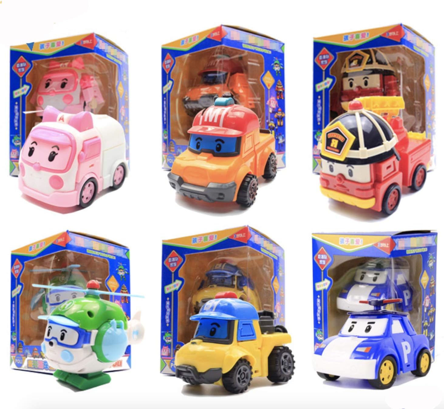 Jouet: véhicule transformable; Quantité: 6 pcs. Taille: env. 9 cm de longeur avant la transformation et 11 cm après la transformation. Personnage: Poli, Roy, Heli, Ambre, Mark, Bucky.