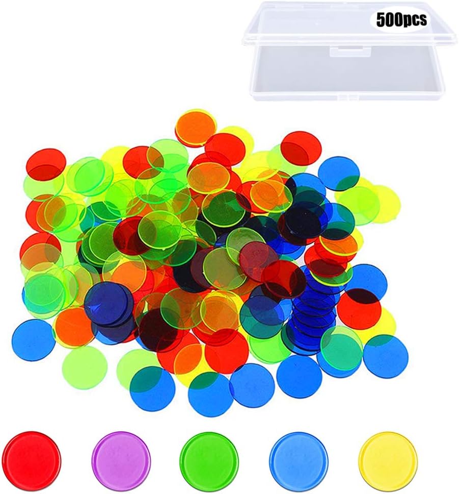 HOSTK 500 pcs jetons de Bingo, comptoirs en Plastique comptant Les jetons colorés, marqueurs de Jeu de Maths Transparents, comptage et Jouets mathématiques avec Une boîte de Rangement (19mm)