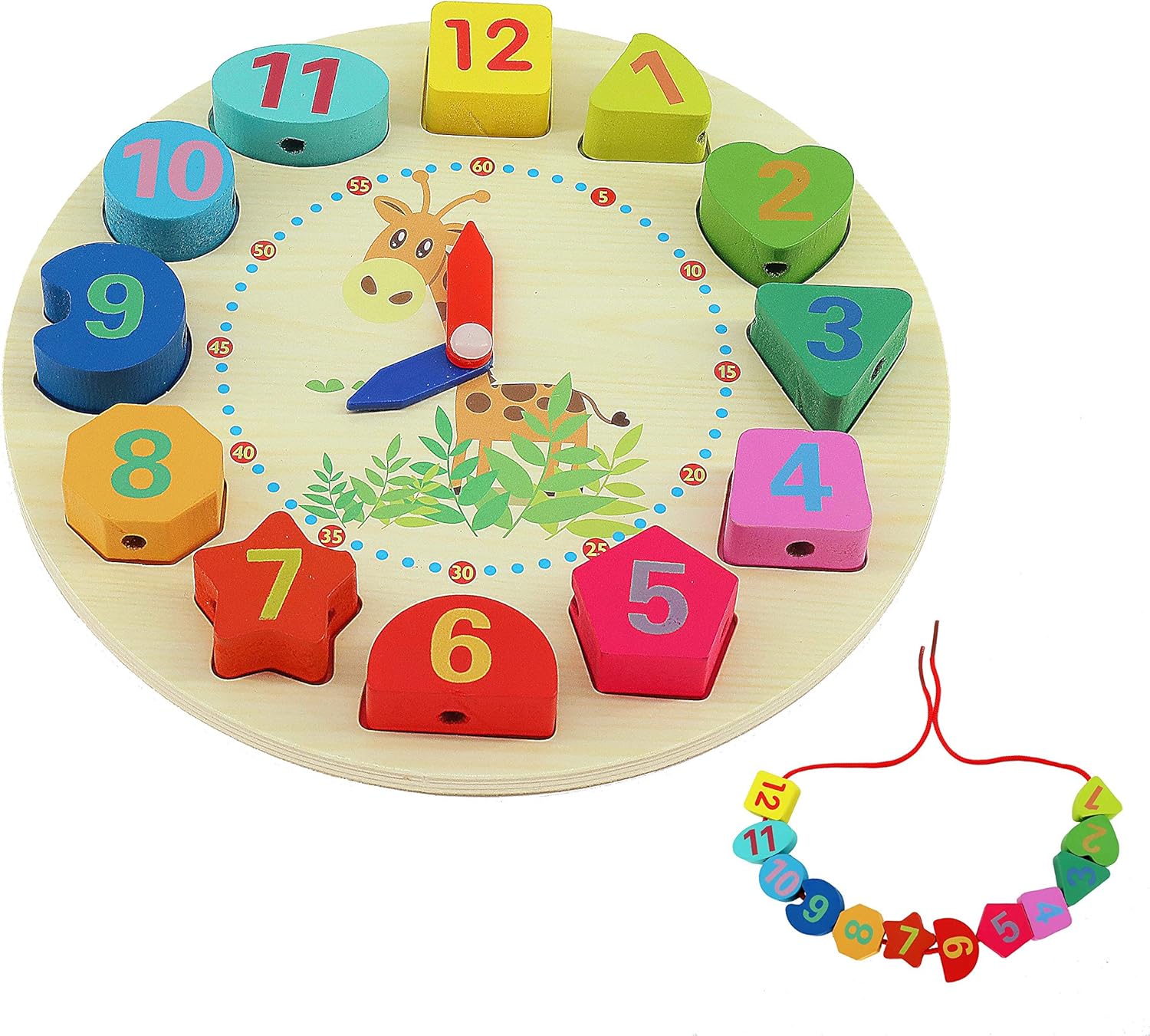 QH-Shop Horloge Apprentissage Jouet ,Horloge Éducative en Bois avec Corde Chiffres et Formes pour Les Enfants